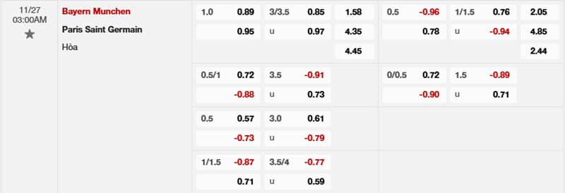 Bảng tỷ lệ kèo Bayern Munich vs PSG