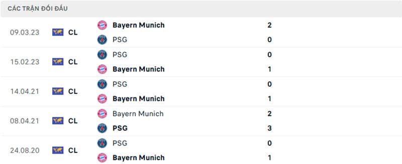 Thành tích đối đầu Bayern Munich vs PSG