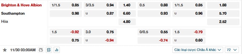 Tỷ lệ kèo Brighton vs Southampton