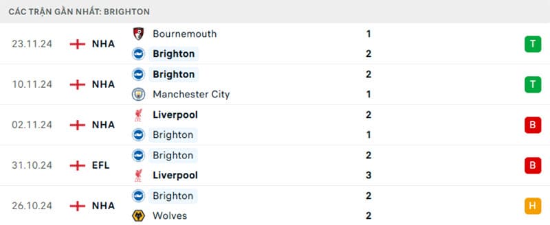 Trong những trận đấu gần đây, Brighton đã thể hiện khả năng tấn công mạnh mẽ. Họ vừa có chiến thắng 2-1 trước Bournemouth và trước đó đã đánh bại Manchester City với cùng tỷ số. Họ cũng đã trải qua một thất bại đáng tiếc 2-1 trước Liverpool tại Anfield. Điều này cho thấy mặc dù Brighton đang thi đấu tốt, nhưng họ vẫn cần cải thiện khả năng duy trì phong độ trước các đối thủ lớn.