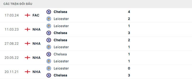 Thành tích đối đầu Leicester vs Chelsea